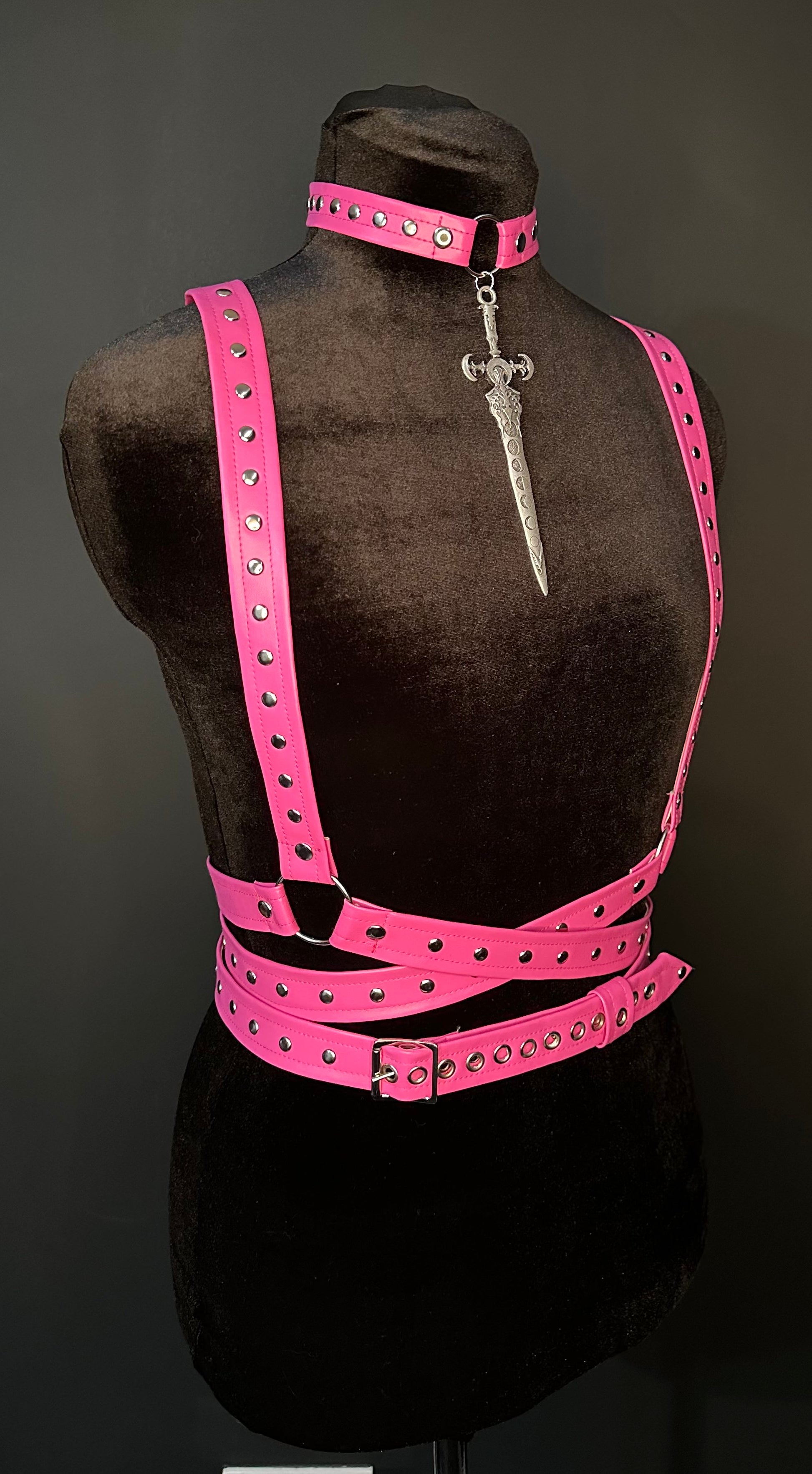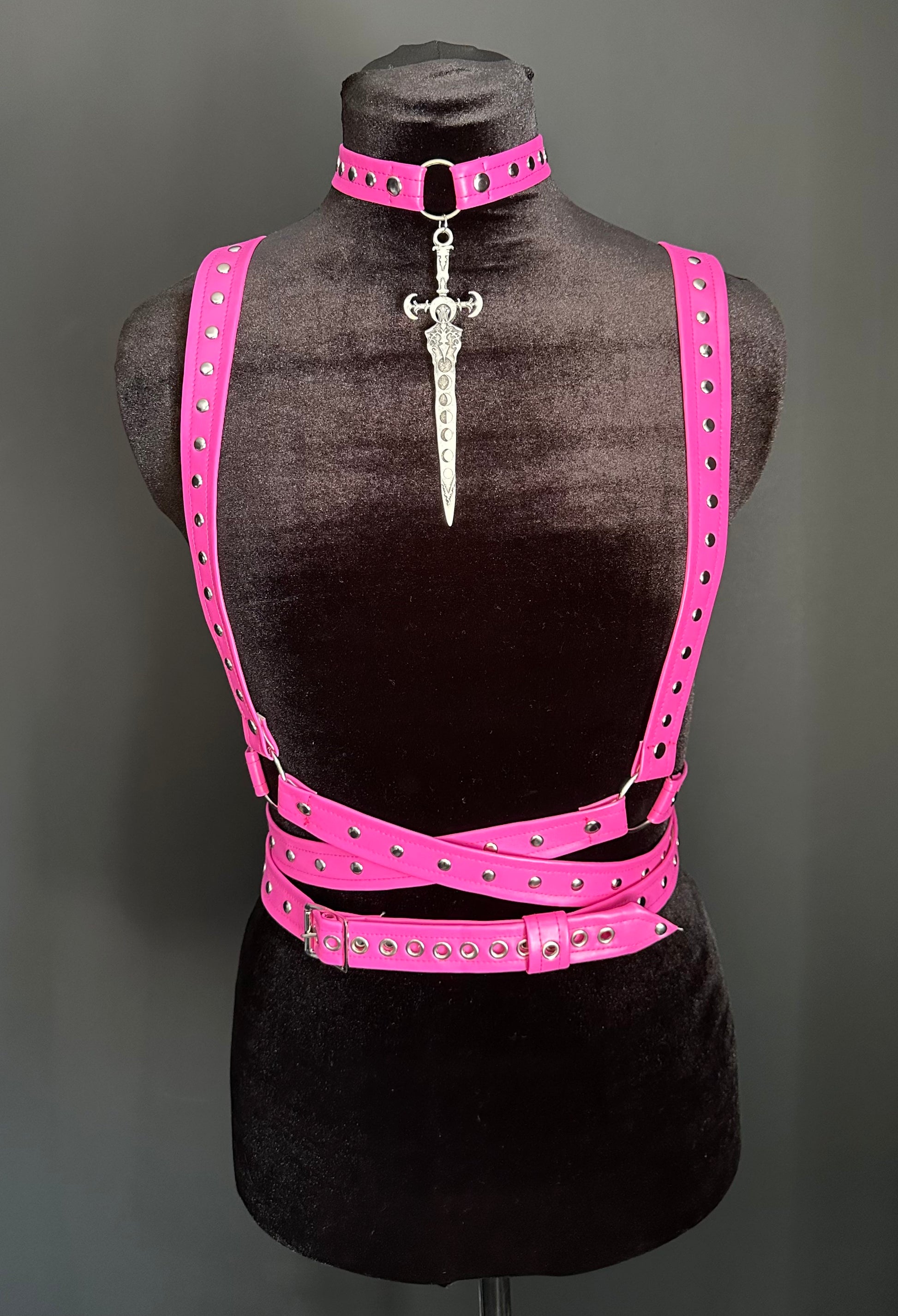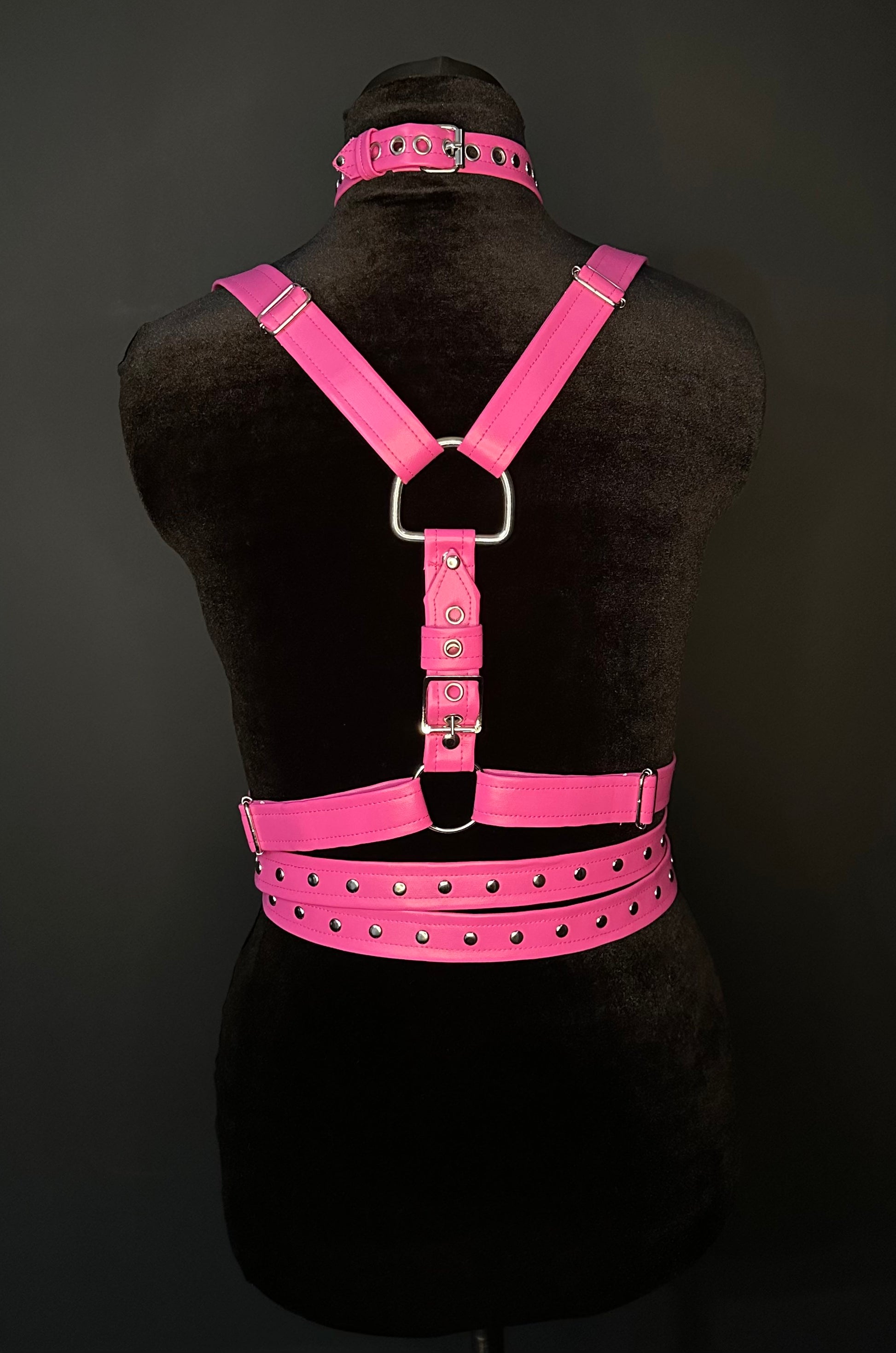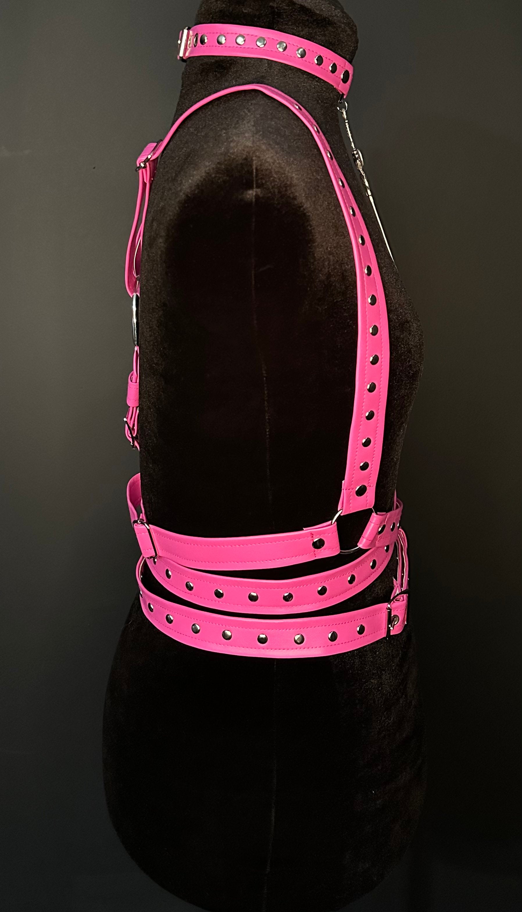 Pink faux leather wraparound harness with silver tone hardware and studs. Adjustable waist and length/shoulder straps.